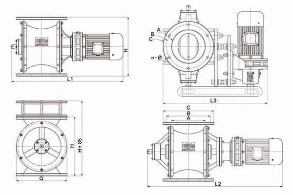 | 型號(hào) | A | B | C | H | Q | L1 (內(nèi)) | L2 (外) | L3 (鏈) | n-Ф | 工作溫度 ℃ | 轉(zhuǎn)速 轉(zhuǎn)/分 | 電機(jī)功率KW | |